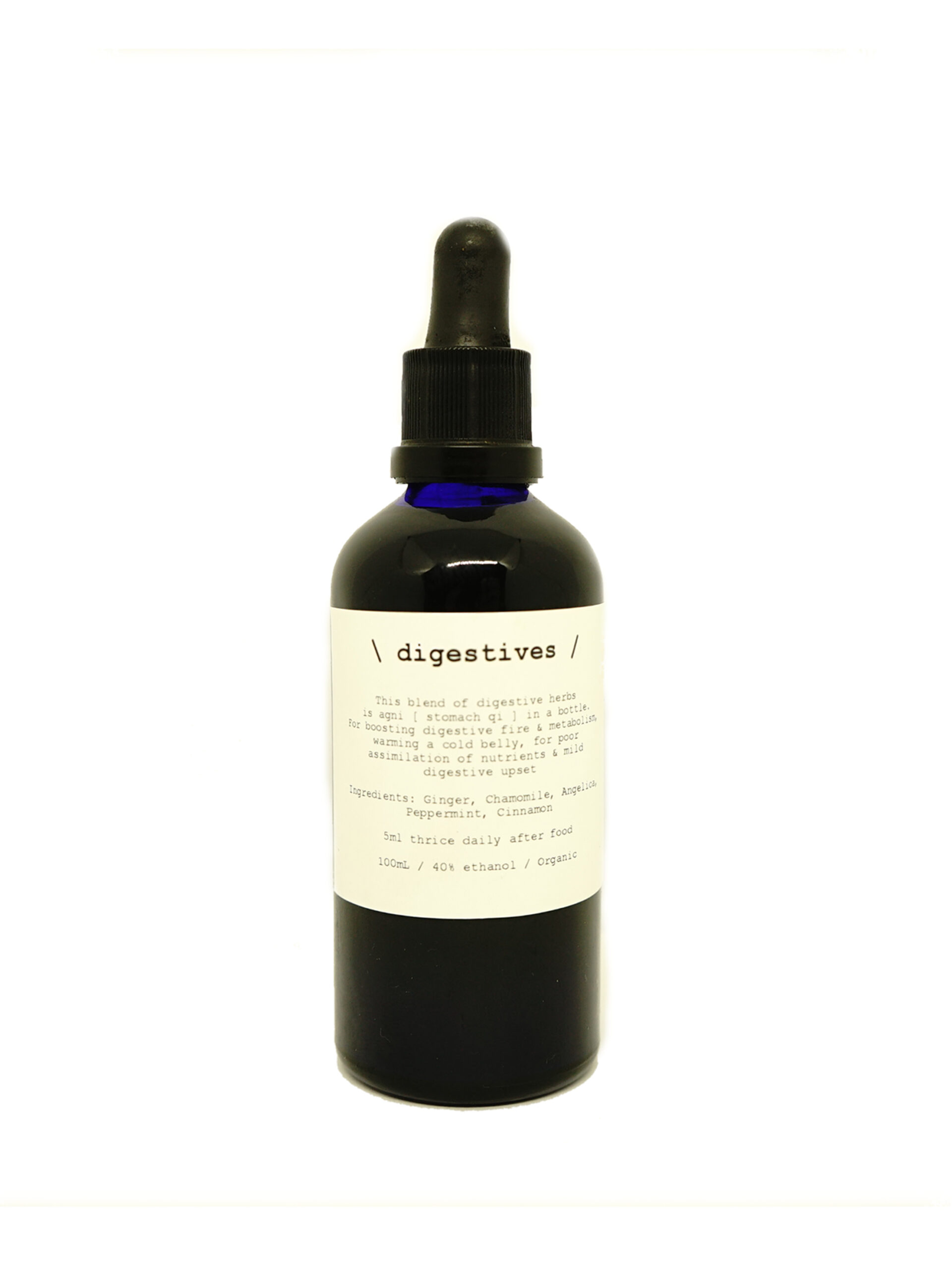 The Digestives tincture is a blend of warming and stimulating digestive herbs that mop up dampness in the digestive tract (sugar cravings, candida, bloating, sluggish digestive) and relieve wind tension (bloating, cramping, dryness in the large intestine, constipation). It may also improve transit time which is known as peristalsis and closely linked with your digestive fire or metabolism. These herbs will also increase liver function and bile production to improve the break down and assimilation of nutrients.